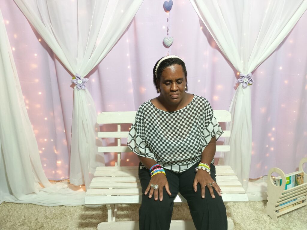 Foto da Carol, ela está sentada em um banco de madeira branco que parece ser parte de uma decoração de estúdio fotográfico. Ela está com os olhos fechados e as mãos repousando sobre as pernas. As pulseiras em seus pulsos são de várias cores, incluindo amarelo, azul, vermelho e verde, e ela também usa um anel prateado em um dos dedos. A blusa xadrez tem um padrão de quadrados pretos e brancos, com mangas que parecem ser soltas e fluídas.