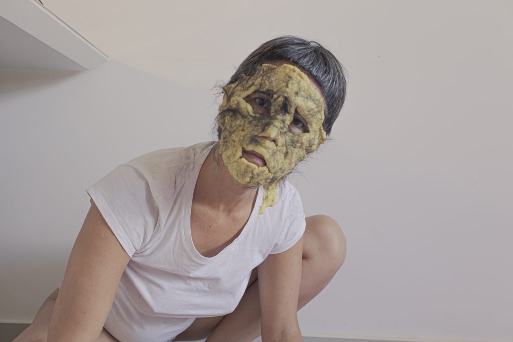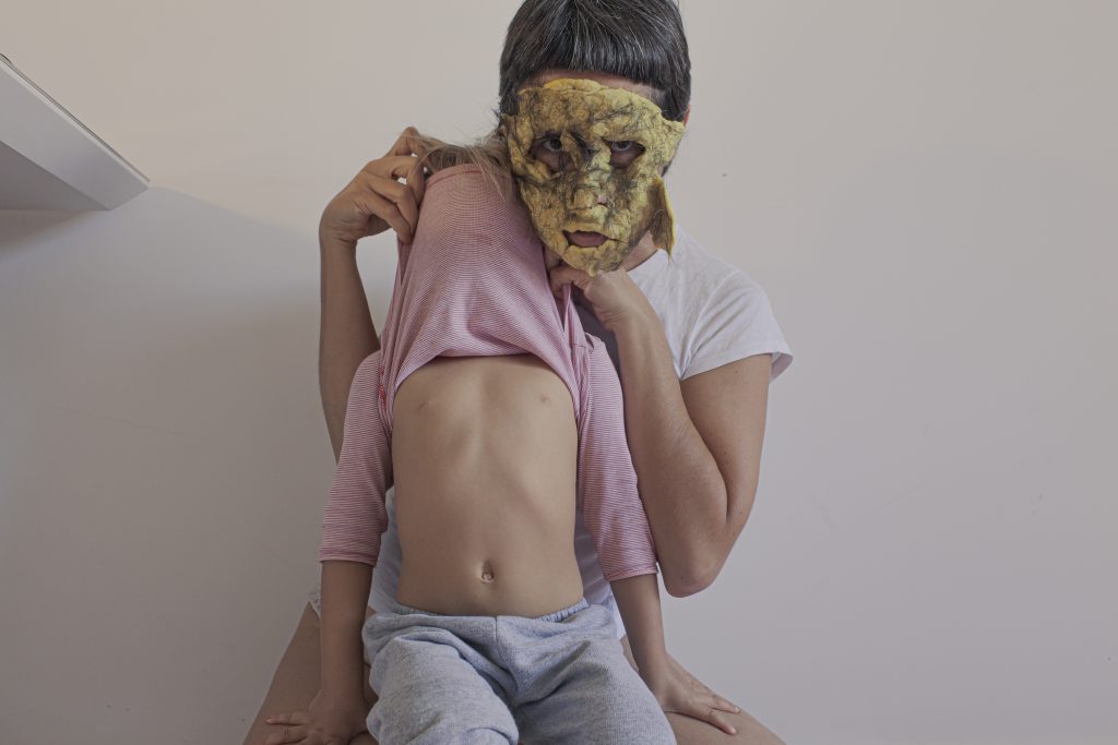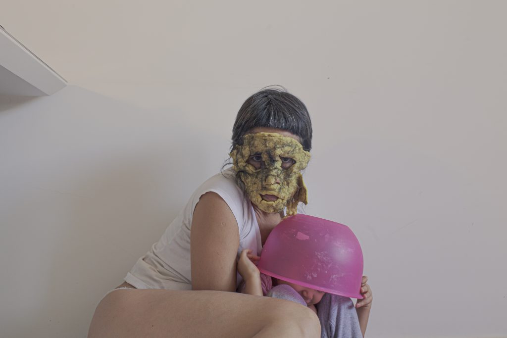 A mãe monstra queria mais tempo sem a filha, pra poder dormir, comer besteira e perceber se vai sentir saudades. Não entende bem esse sentimento, sente medo de ser muito julgada, amargura. Veste a monstra, absorve a monstra, e se cansa. Tira a máscara e a monstra vai embora, mas ela sempre volta.